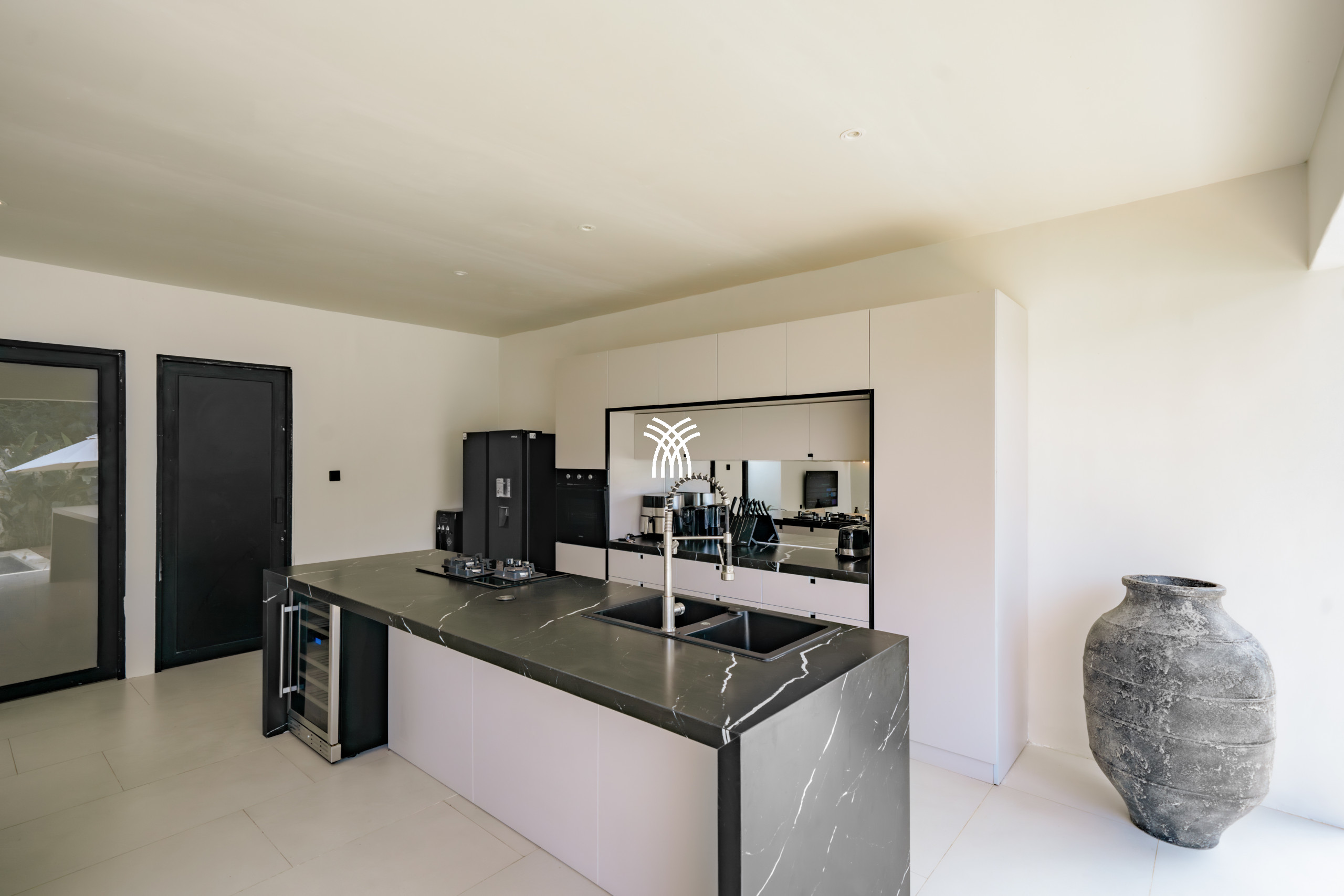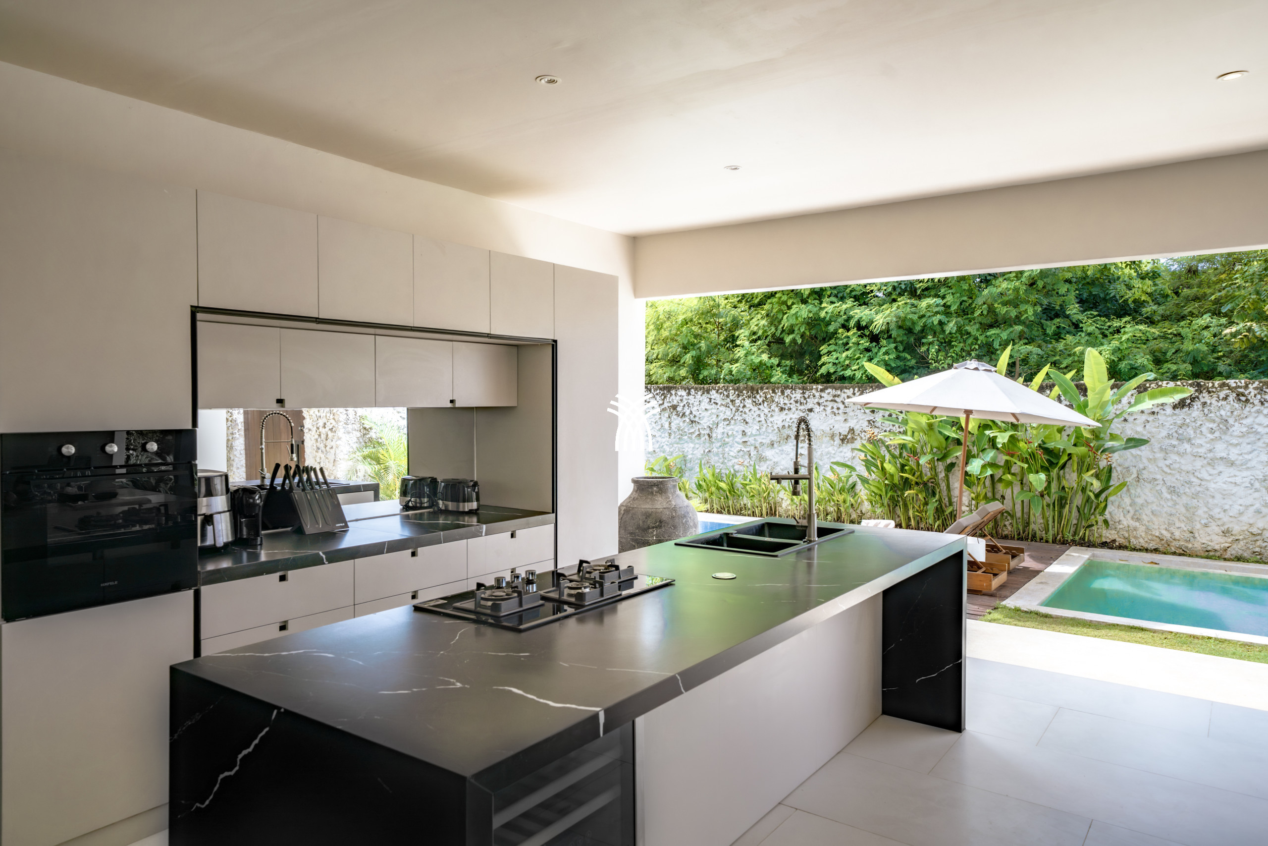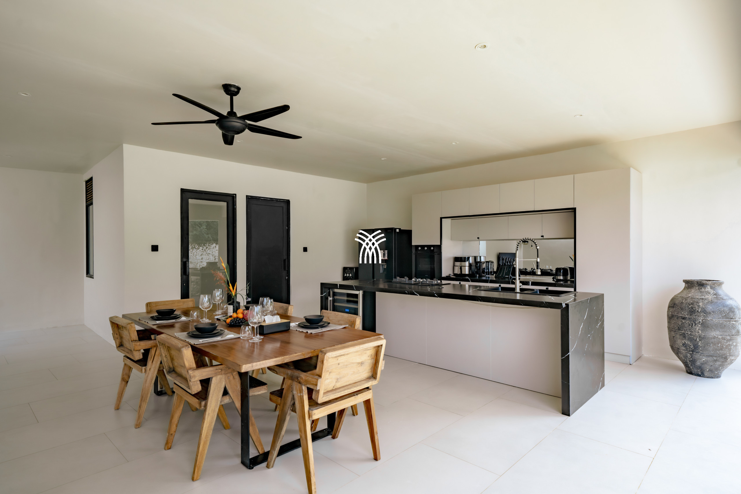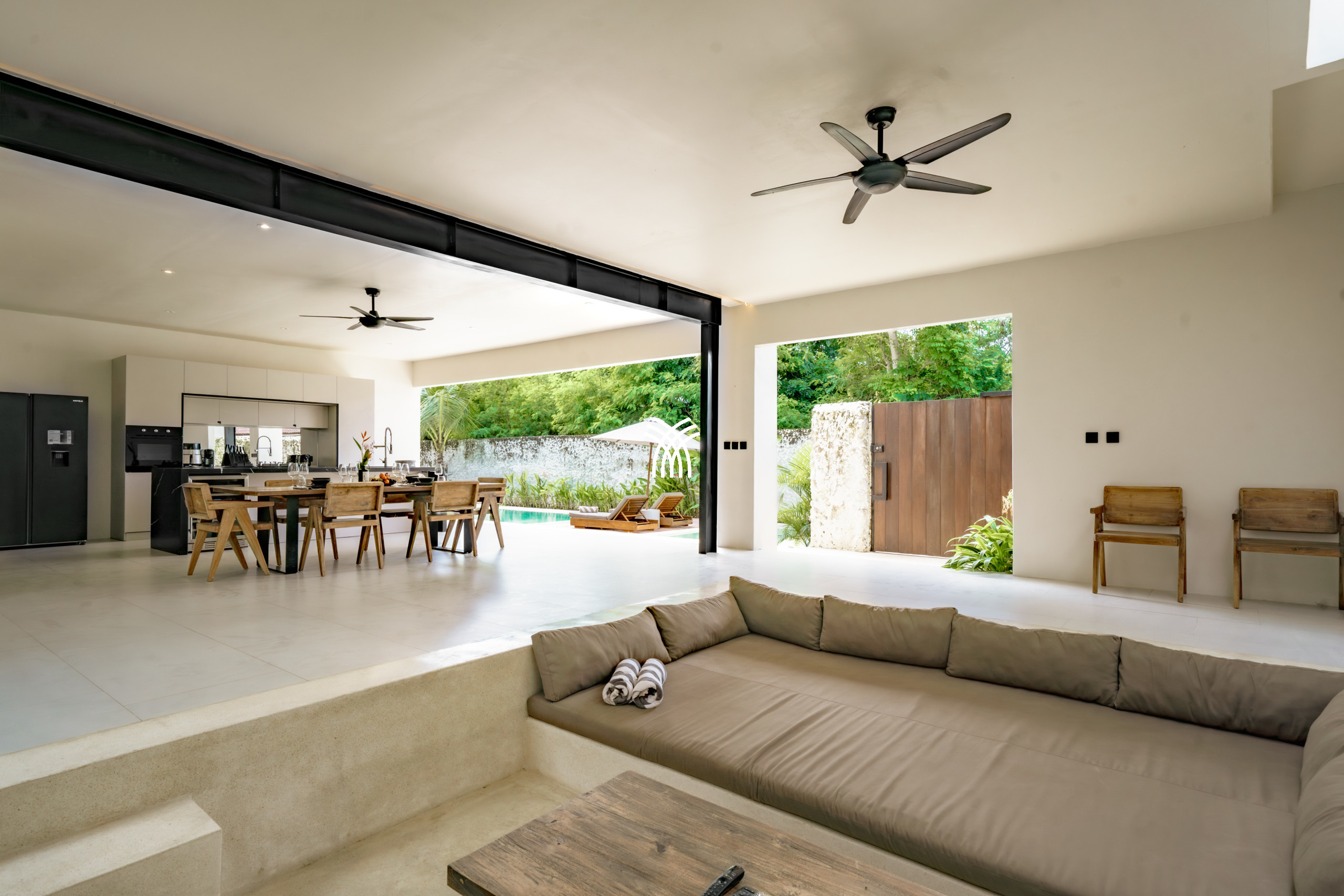 Designed for comfort and effortless living, the villa features three spacious bedrooms with king-size beds, plush linens, and air-conditioning, complemented by elegant bathrooms with modern fittings, rain showers, and hot water. A large private pool and a dedicated kids pool are framed by lush tropical greenery, creating an idyllic setting for sun-soaked relaxation and refreshing moments under Bali’s warm skies. The open-plan living area, enhanced by expansive glass walls, invites natural light to flow seamlessly through the space, while the fully equipped modern kitchen and dining area provide the perfect backdrop for shared meals and memorable gatherings.