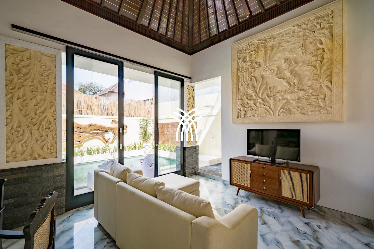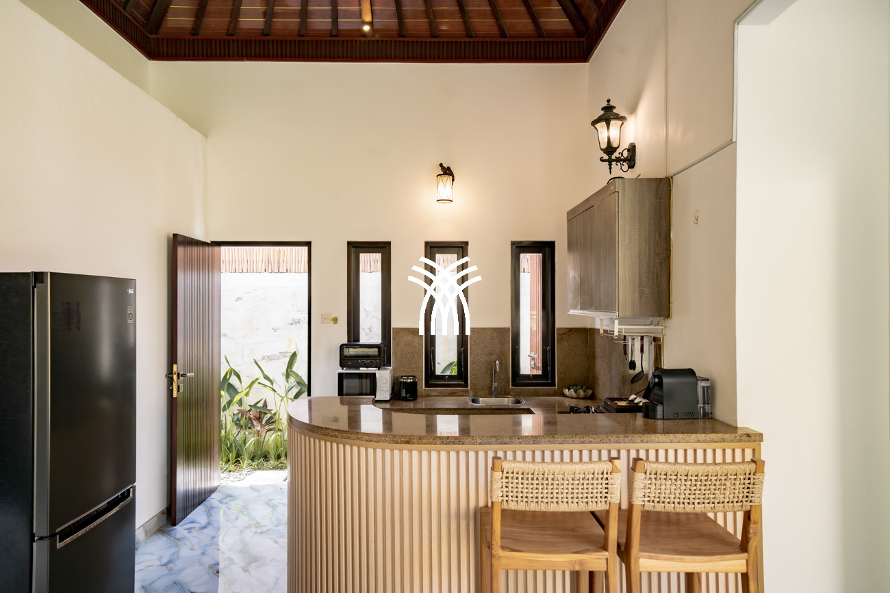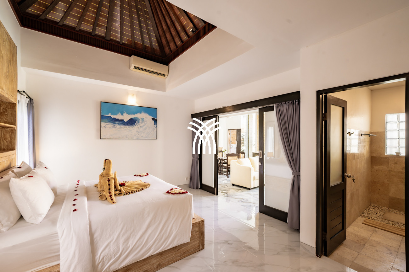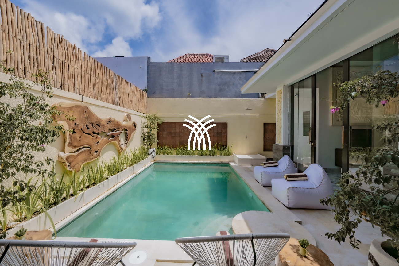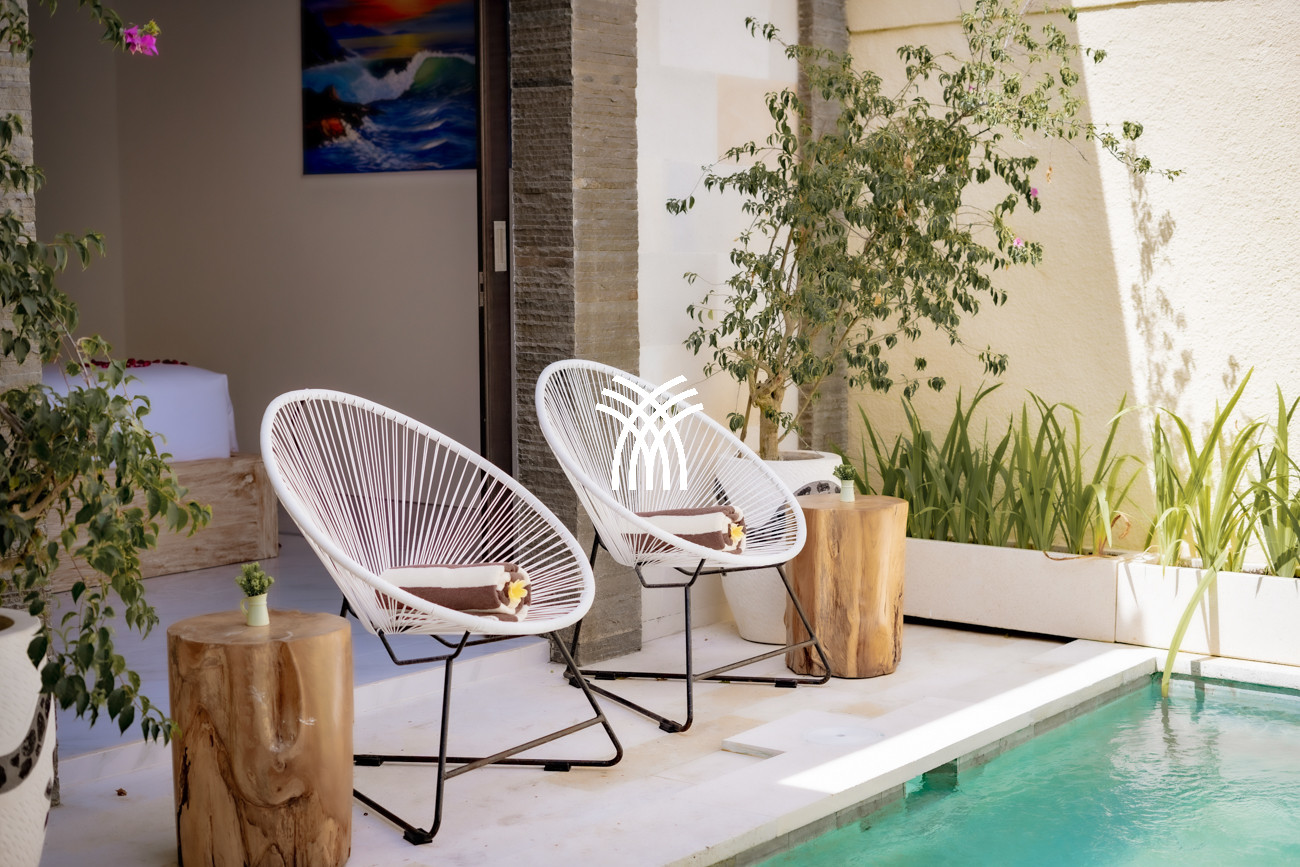 Designed for couples, small families, or surfers seeking tranquility after the waves, the villa unfolds across approximately 160 square metres of thoughtfully curated living space, where two spacious bedrooms with king-size beds, plush linens, and air-conditioning create an atmosphere of comfort and serenity. Two elegant bathrooms with modern fittings and rain showers enhance everyday indulgence, while the private pool framed by loungers invites moments of relaxation under Bali’s warm sun. A functional kitchen equipped with a fridge, microwave, and essential amenities, complemented by a high counter and high chairs, creates an inviting setting for shared meals and effortless social moments, while private and secured parking for one car and at least two motorbikes ensures convenience and peace of mind throughout your stay.