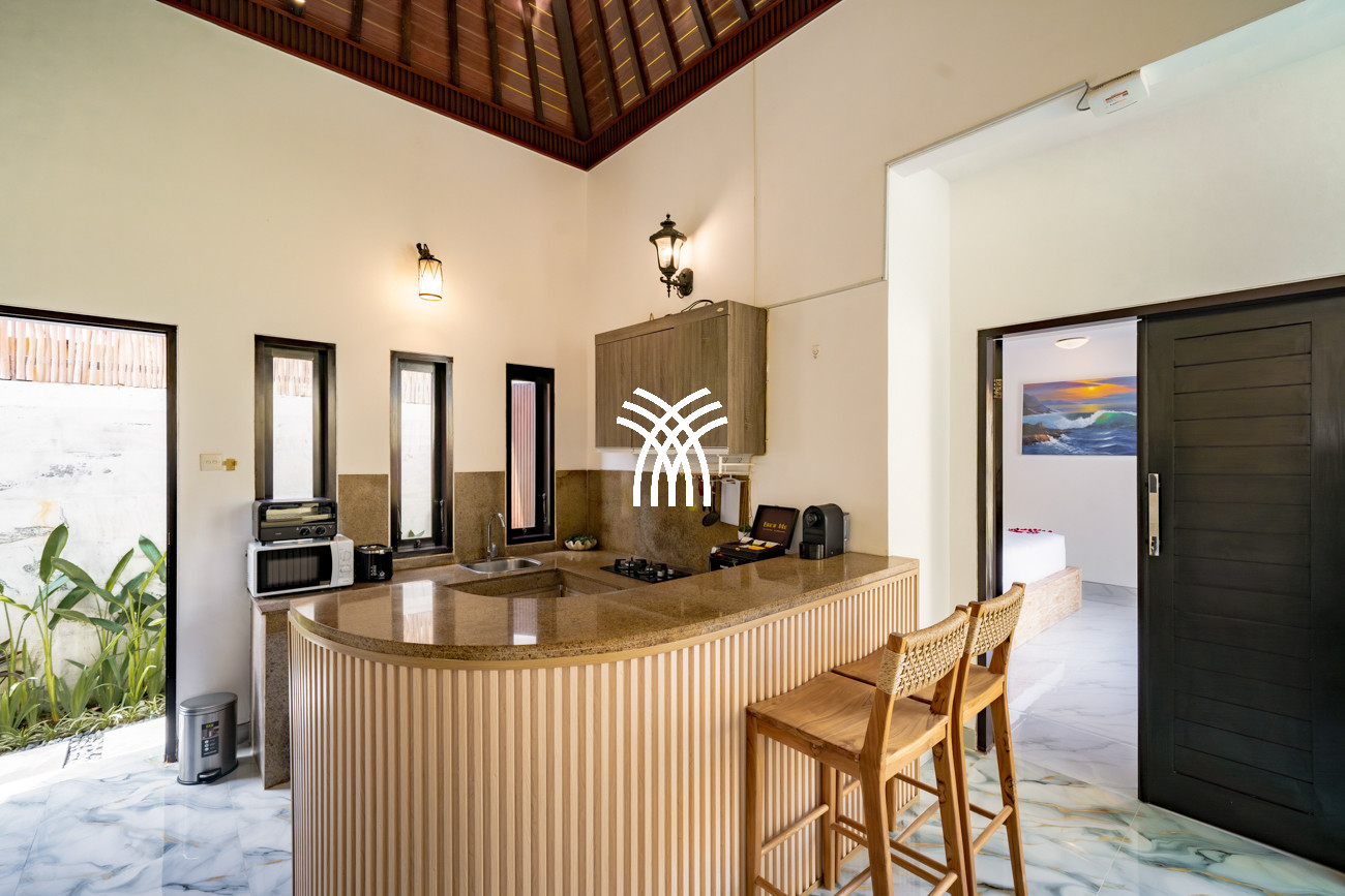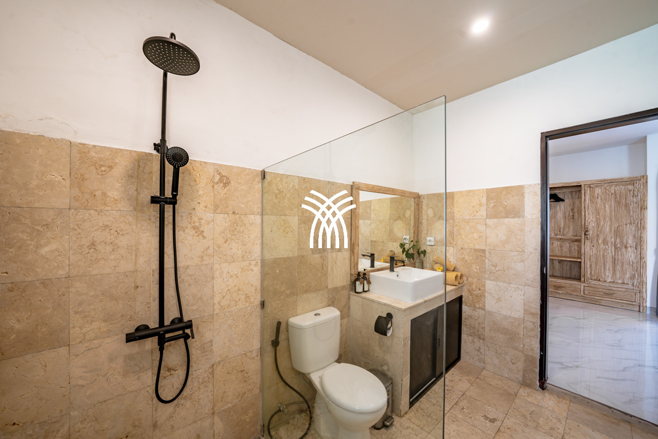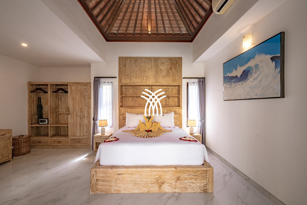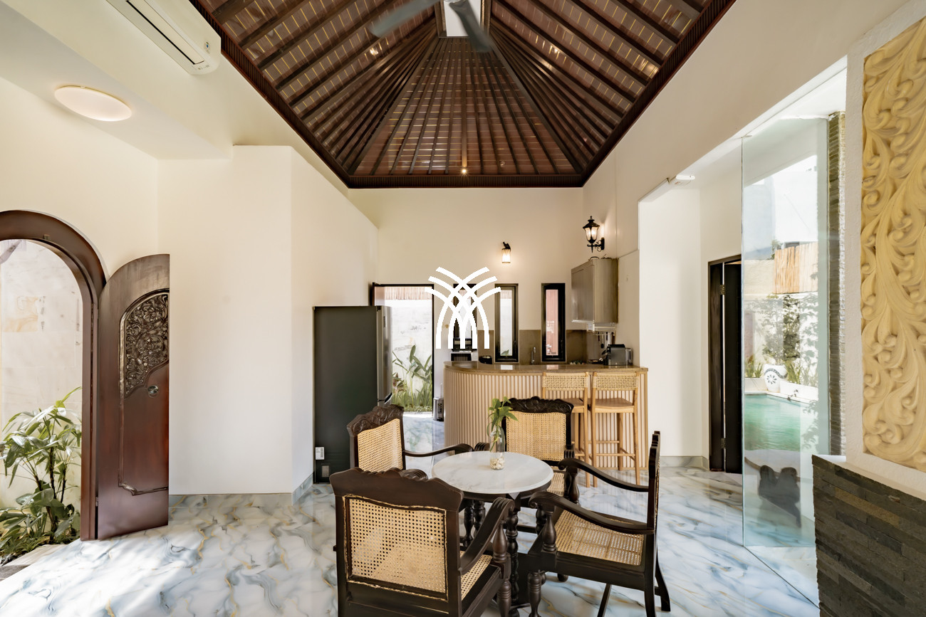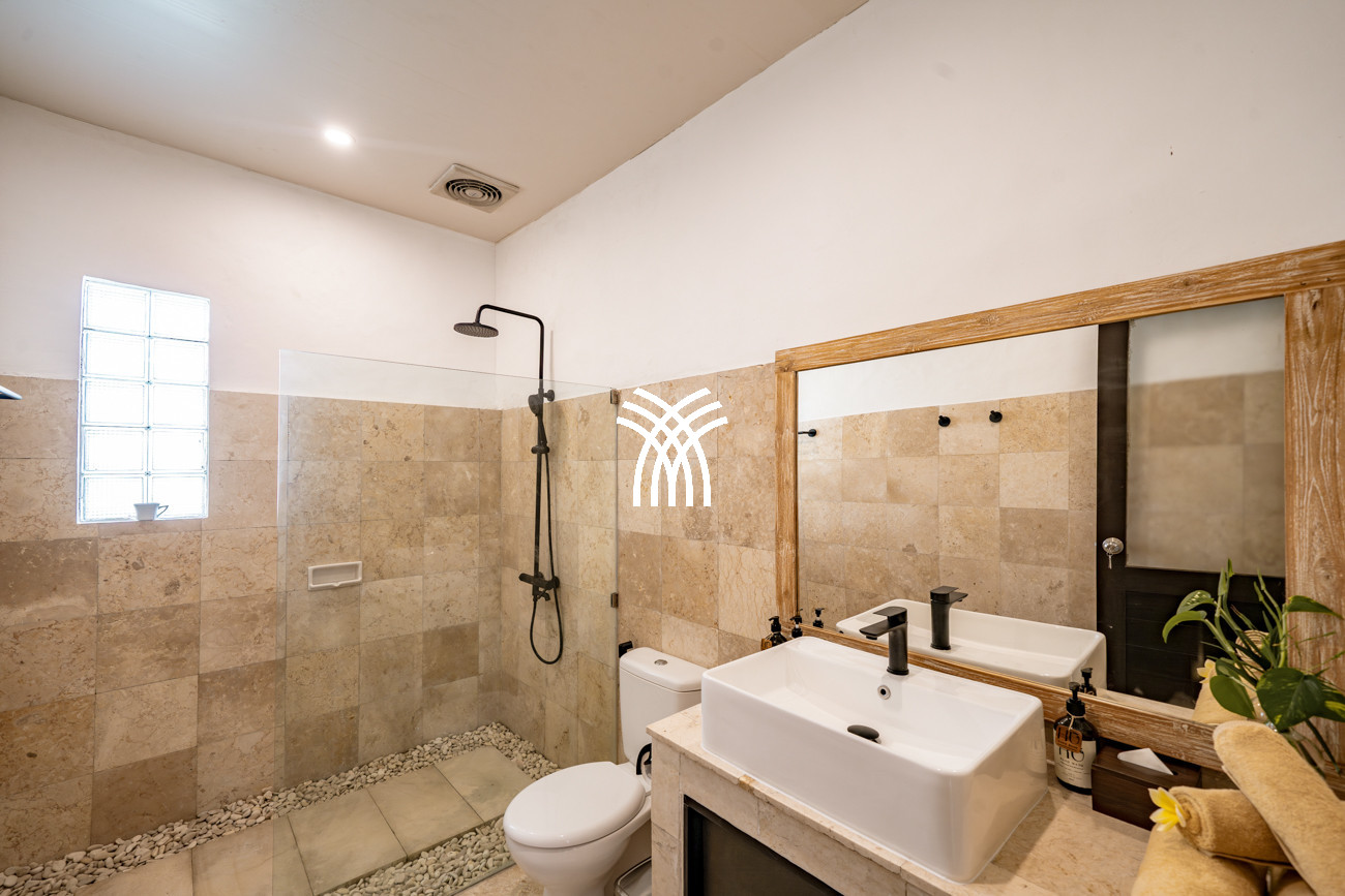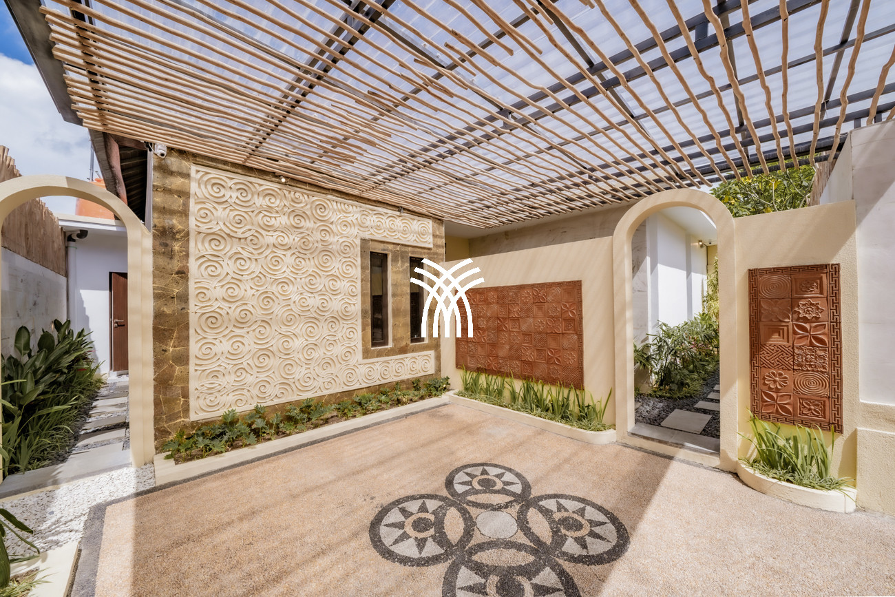 Designed for couples, small families, or surfers seeking tranquility after the waves, the villa unfolds across approximately 160 square metres of thoughtfully curated living space, where two spacious bedrooms with king-size beds, plush linens, and air-conditioning create an atmosphere of comfort and serenity. Two elegant bathrooms with modern fittings and rain showers enhance everyday indulgence, while the private pool framed by loungers invites moments of relaxation under Bali’s warm sun. A functional kitchen equipped with a fridge, microwave, and essential amenities, complemented by a high counter and high chairs, creates an inviting setting for shared meals and effortless social moments, while private and secured parking for one car and at least two motorbikes ensures convenience and peace of mind throughout your stay.