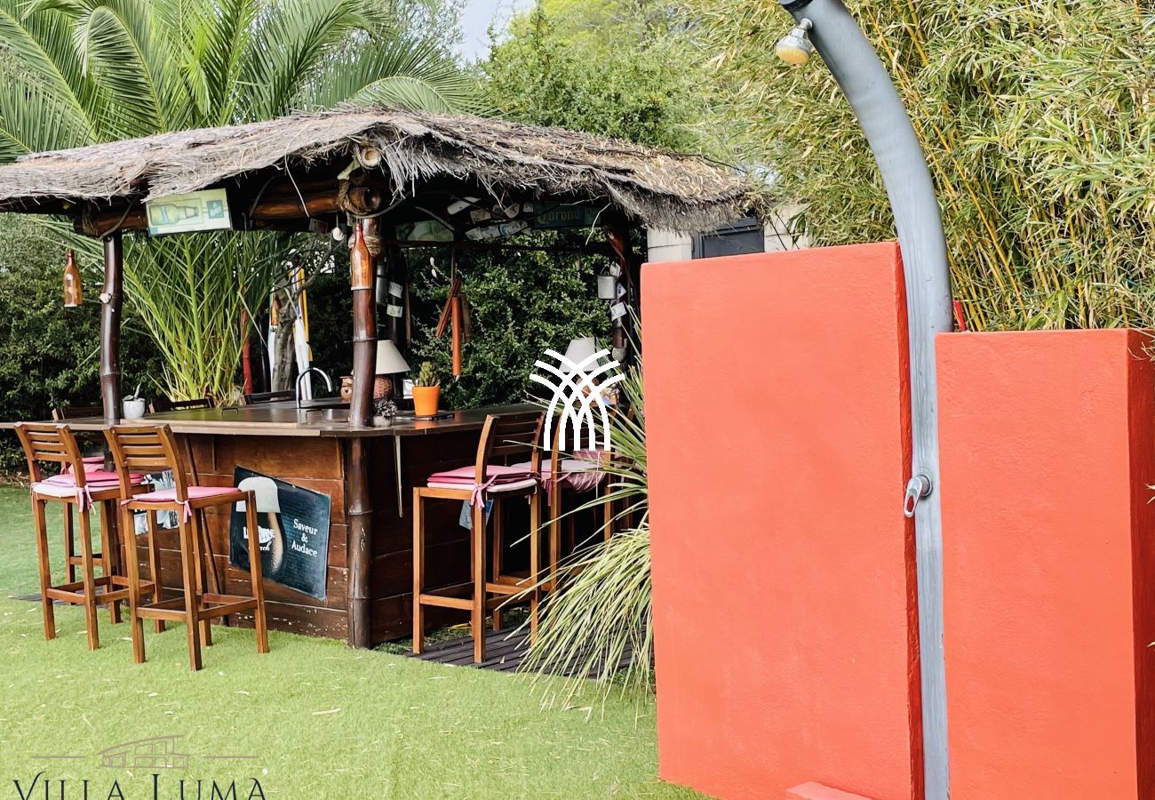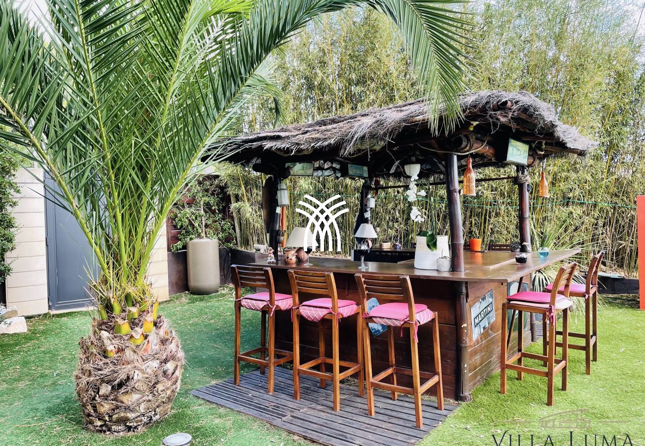 Exotic pool house with two planchas, refrigerator, audio system. Hammock and ping-pong table. Parking for 5 cars. Amenities 3 km. Sea & beach 3km.